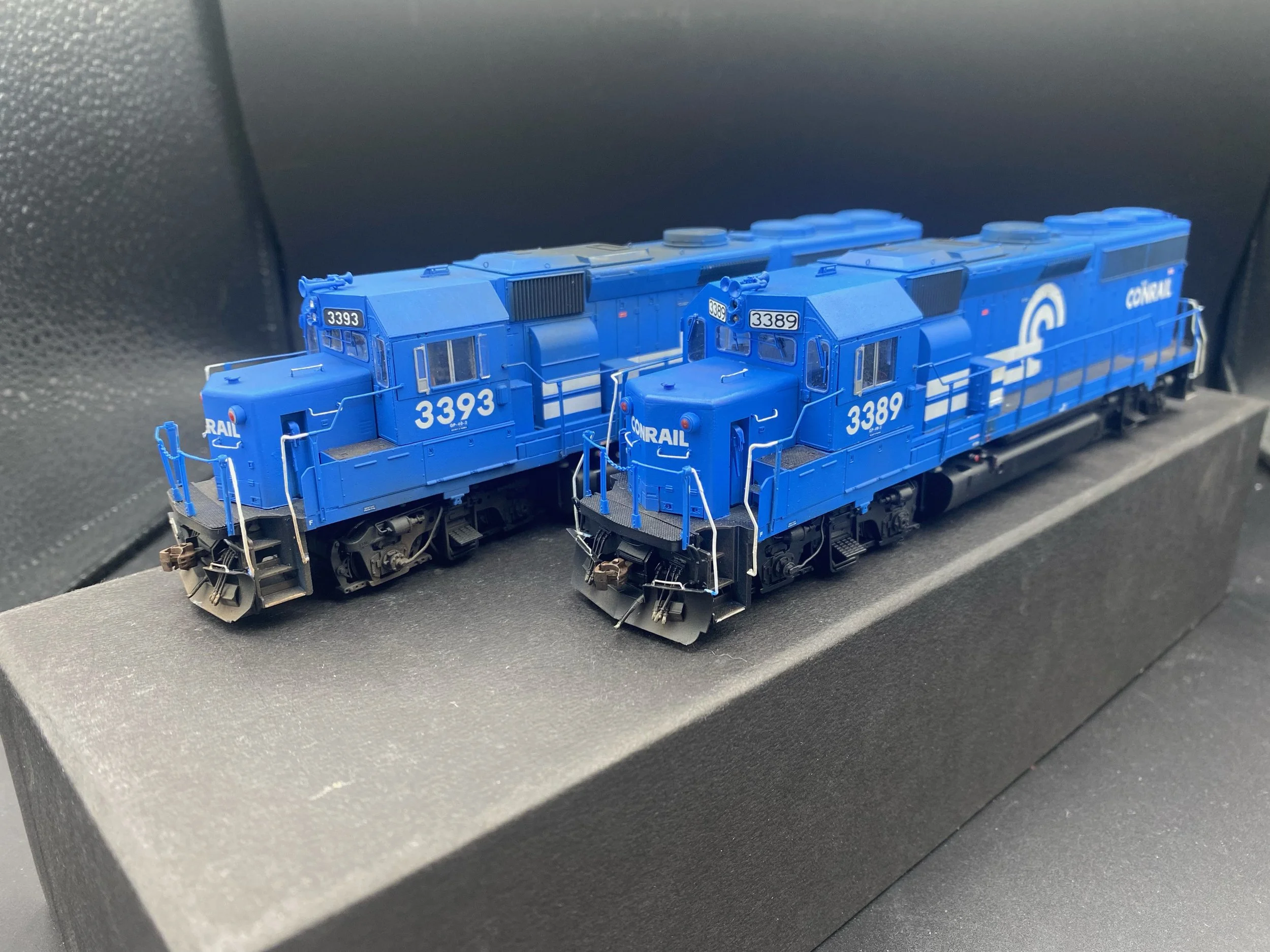 CR 3389 + 3393Custom painted, detailed, and weathered.Features Cannon and Co nose, sub-base, and much moreFeatures custom designed front + rear marker lights designed by KPMHeavily modified Athearn GP40-2’s